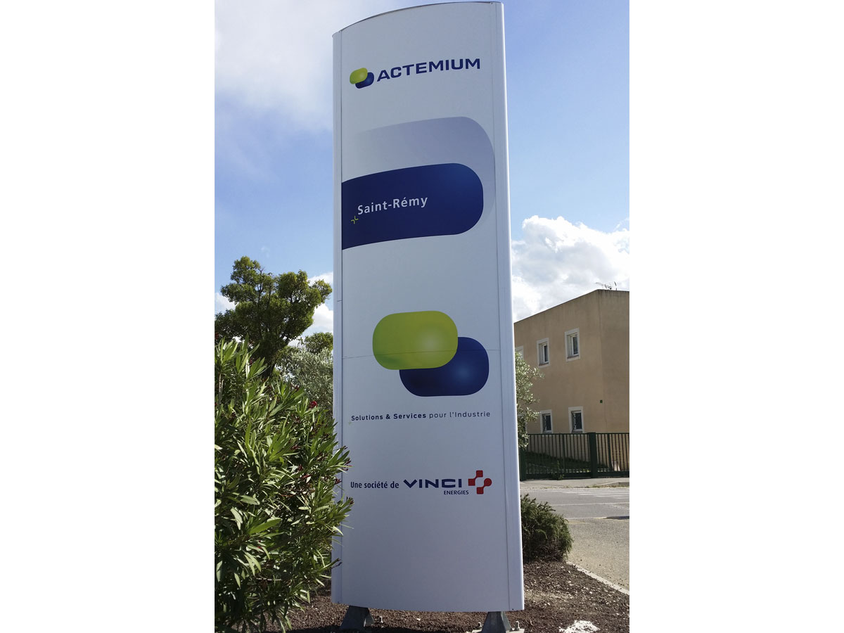 Le totem est un support vertical fixé au sol, il est réalisable dans une grande variété de formats, de forme (galbée ou plate) et différents procédés de marquage, d’éclairage, selon votre identité visuelle. Il peut être placé à l’extérieur mais aussi à l’intérieur de votre bâtiment.
